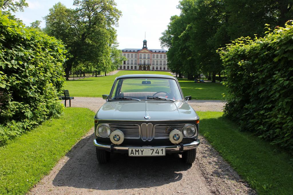 Sædvanen tro så kontrollerede vi motorolie og kølevæske på den charmerende 66’er og rensede forruden. Alt så fint ud, men da vi startede M10 motoren op, blev vi desværre mindet om hullet i bagpotten, som dog ikke var blevet meget højlydt. Endnu! Inden afgang blev der lige tid til en lille foto session ved slottet, og så var det ellers ud på de svenske landeveje.