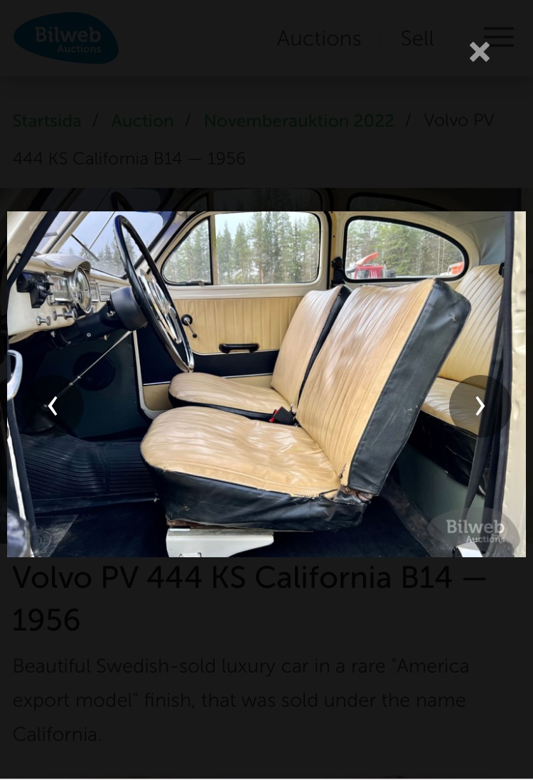 @Jens G I dette tilfælde refererer california blot til navnet på den hvide farve med kode 42, og på tværs af årgangene var kombinationen, hvid havde rødt indtræk og det er en ganske flot kombination. Din kammerats far har haft en Californiahvid 544. Men Volvo lavede til modelår 1956 en speciel model Af PV444 som hed Californiamodel med henblik på eksport til USA. Den var hvid med sort og gult indtræk og havde sort rat, som P1900, i stedet for hvidt. Motoren var med to karburatorer (75 hk) og blankpoleret ventildæksel hvilket senere blev kendetegnet på en B16 sport, og gearkassen var med fire gear mod normalt tre.
